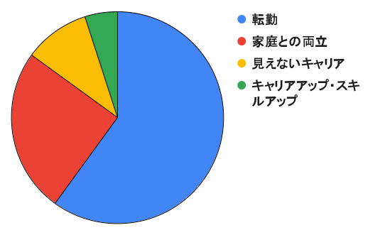 圧倒的に「転勤」や「家庭との両立」の割合が大きく、キャリアアップに関しては全体の5%です。